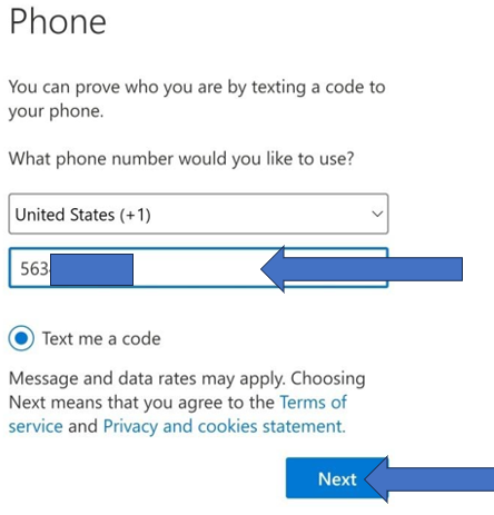 Type in your phone number starting with the area code then click Next