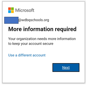 The District requires dual authentication for account access. Click next to setup verification with using text to your cell phone.